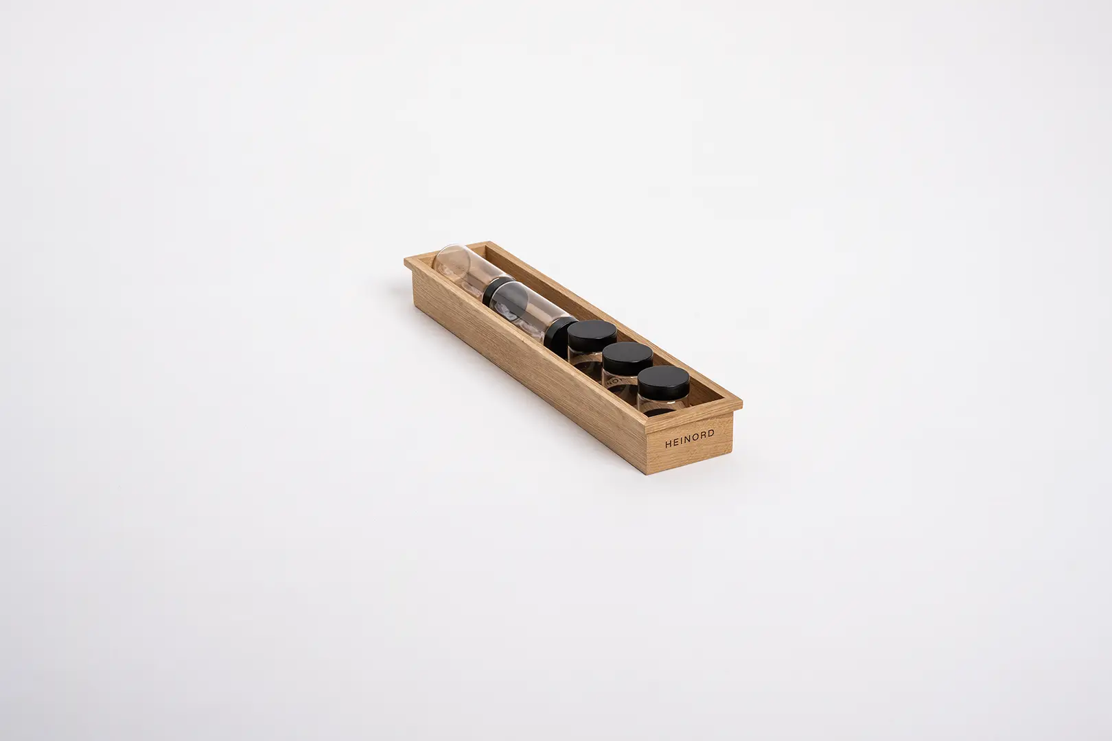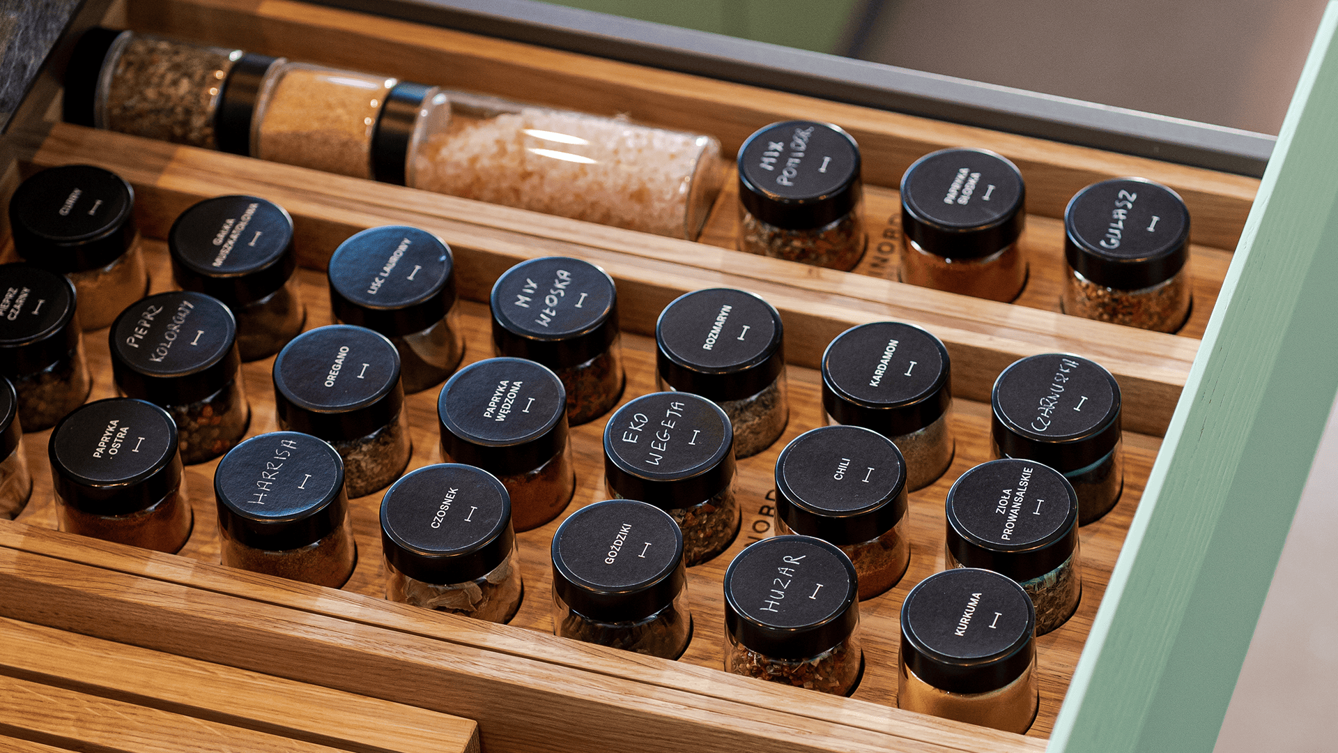 Elegancki organizer z litego dębu do przechowywania niskich i wysokich słoiczków na przyprawy.