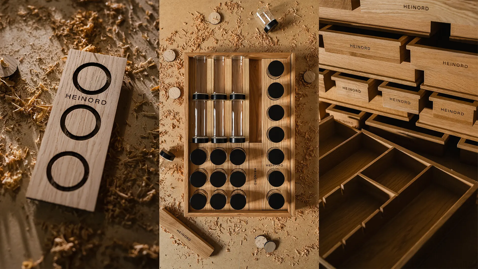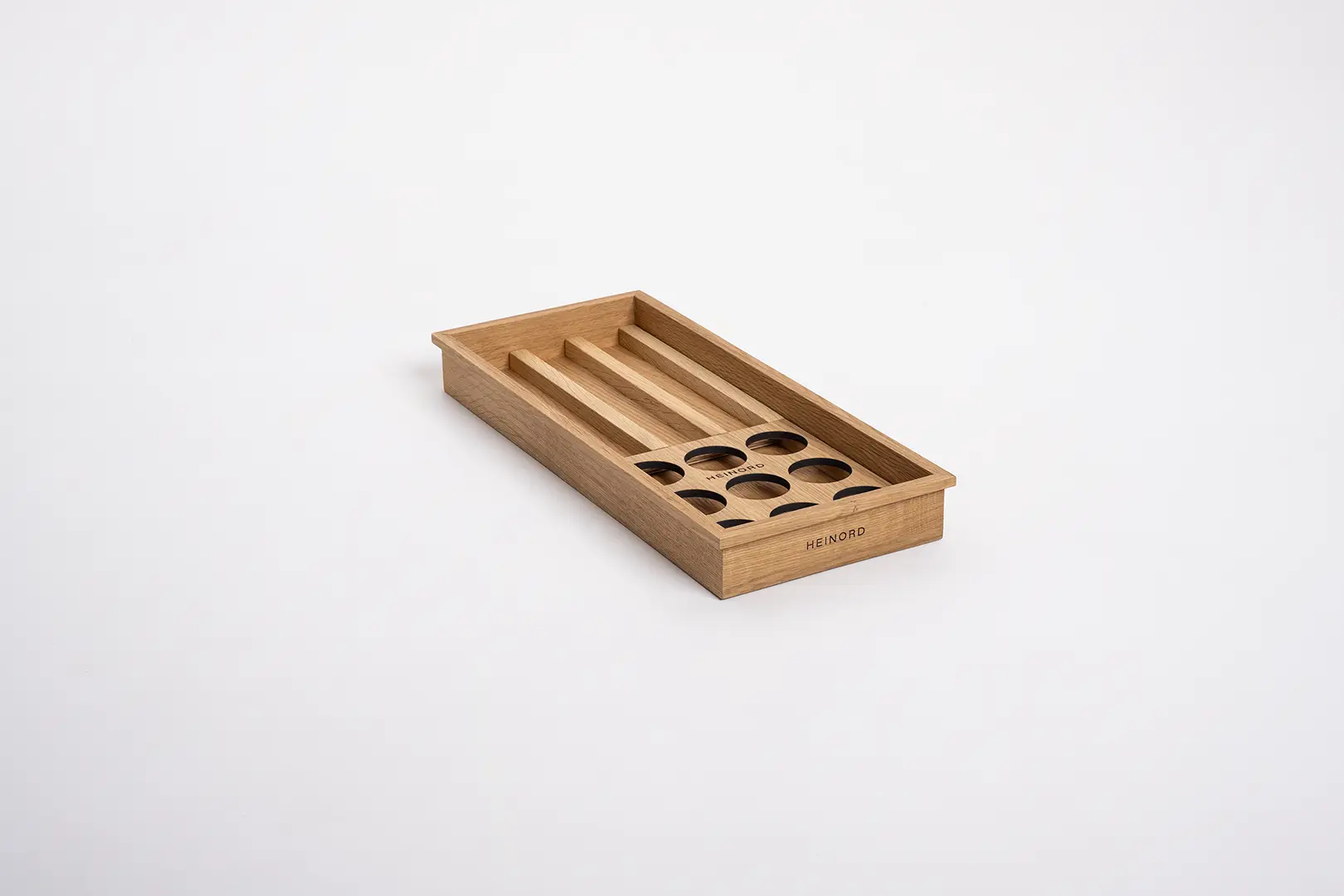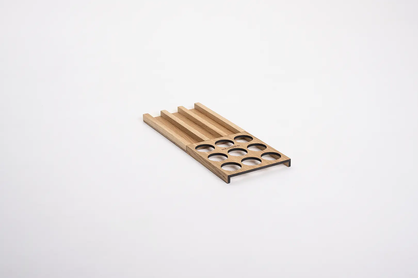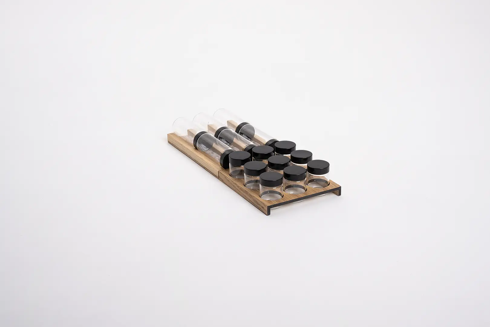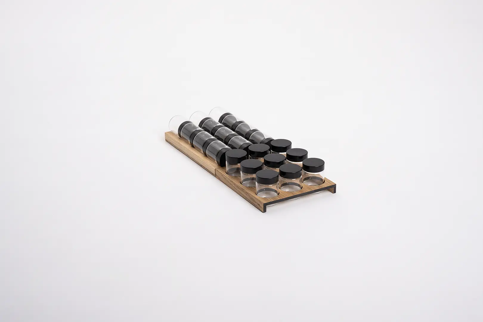 Elegancki organizer z litego dębu do przechowywania niskich i wysokich słoiczków na przyprawy.